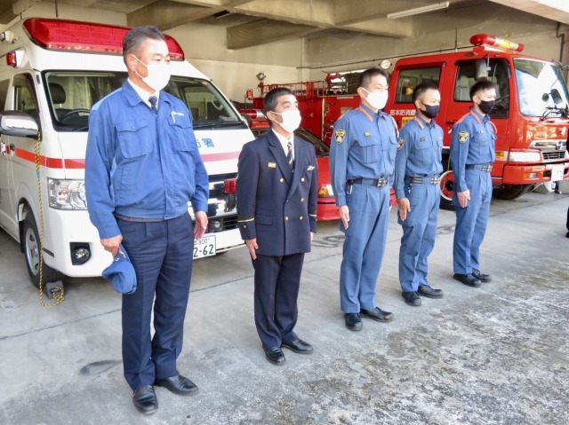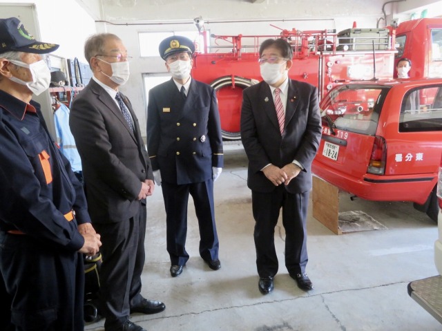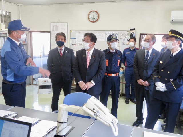 総務大臣、消防庁・内藤長官「 人吉下球磨消防組合・管理者〔 錦町・森本町長 〕、副管理者〔 球磨村・松谷村長 〕より 令和2年7月豪雨災害被災状況 聴取 」( 球磨村・人吉下球磨消防組合中央消防署 西分署 )※溝口県議、熊本県・田嶋副知事ほか同席