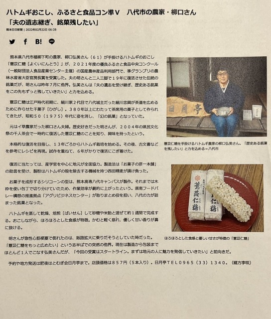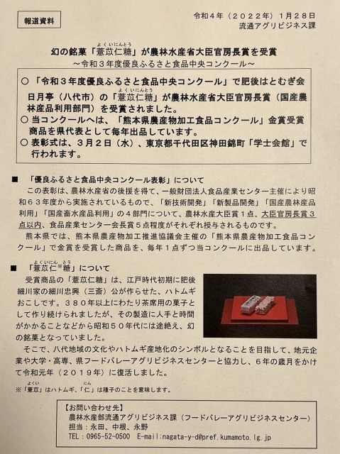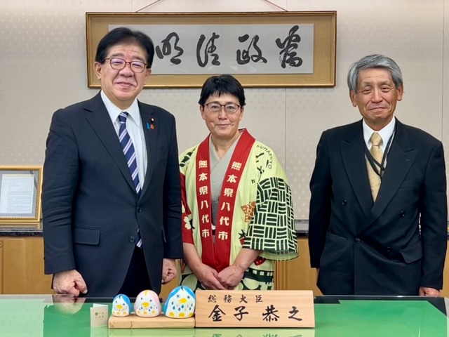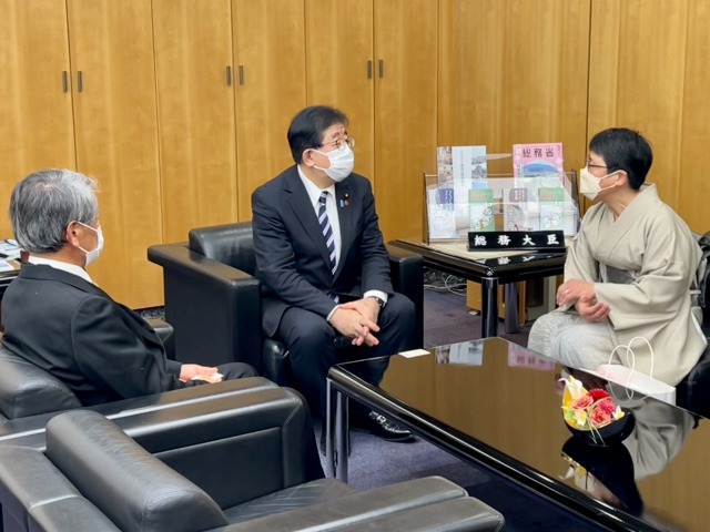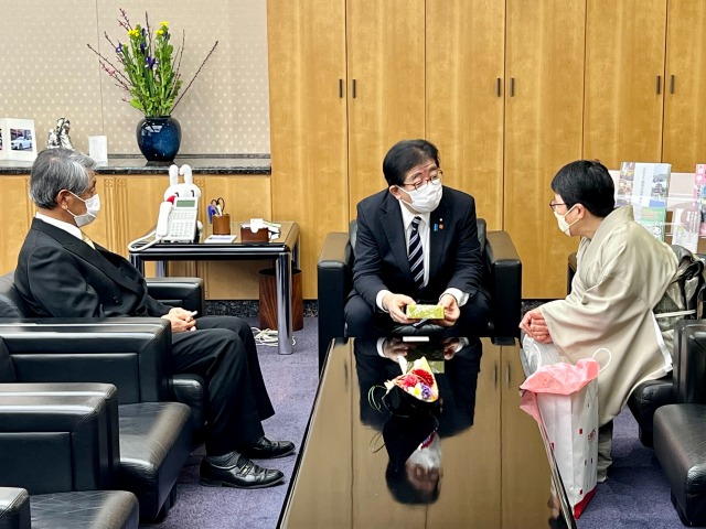 肥後はとむぎ会 日月亭(八代市)・柳口弘美代表「令和3年度 優良ふるさと食品中央コンクールにおける「薏苡仁糖(よくいにんとう)」の 農林水産省 大臣官房長賞(準グランプリ)受賞」報告来室(総務大臣室)