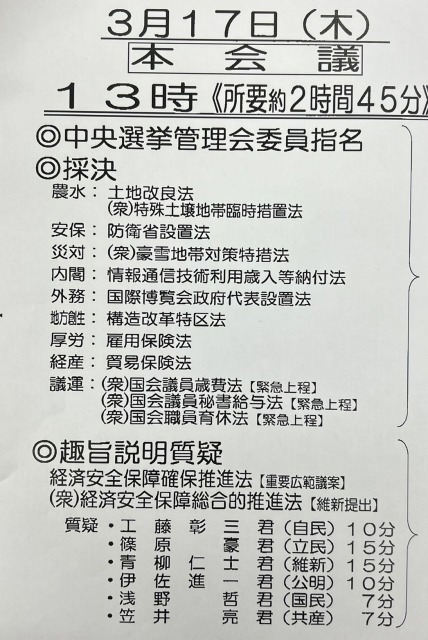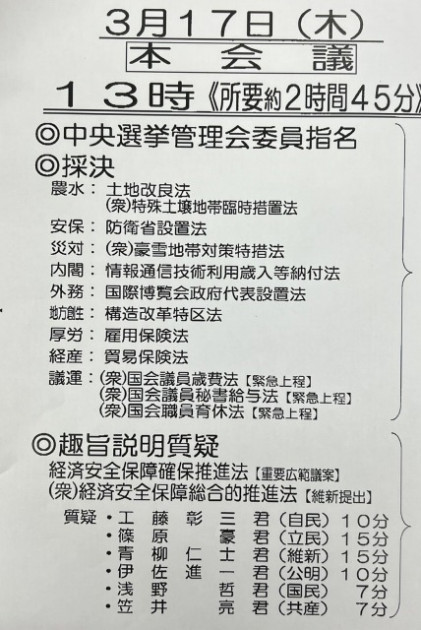 13:00~衆議院本会議「中央選挙管理委員会委員指名、4委員4件他 採決、経済安保推進法 趣旨説明・質疑」