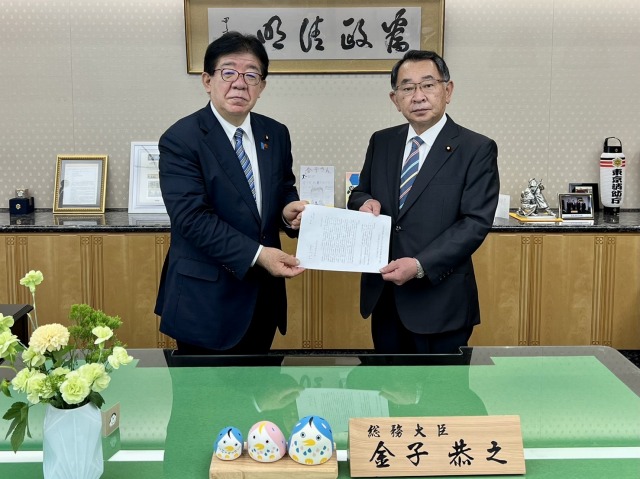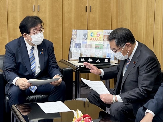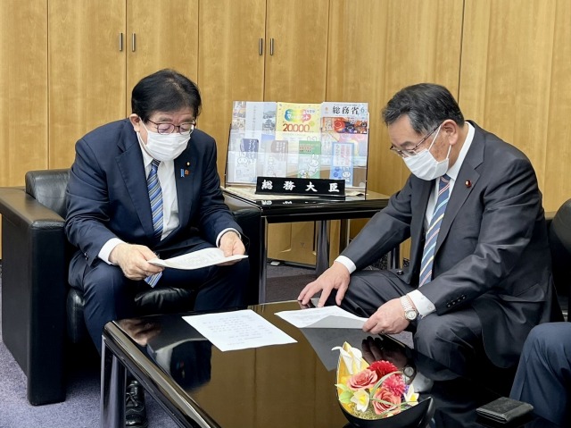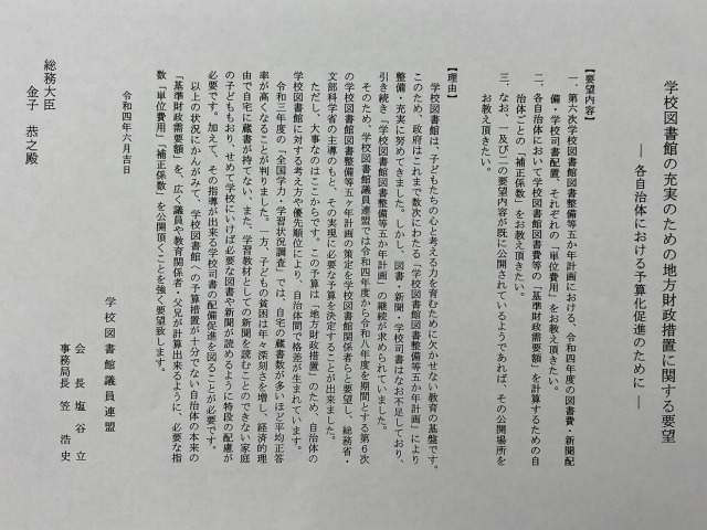 超党派 学校図書館議員連盟・塩谷会長「学校図書館の充実のための地方財政措置に関する要望」来室(総務大臣室)