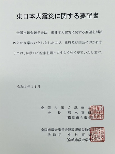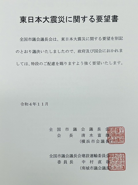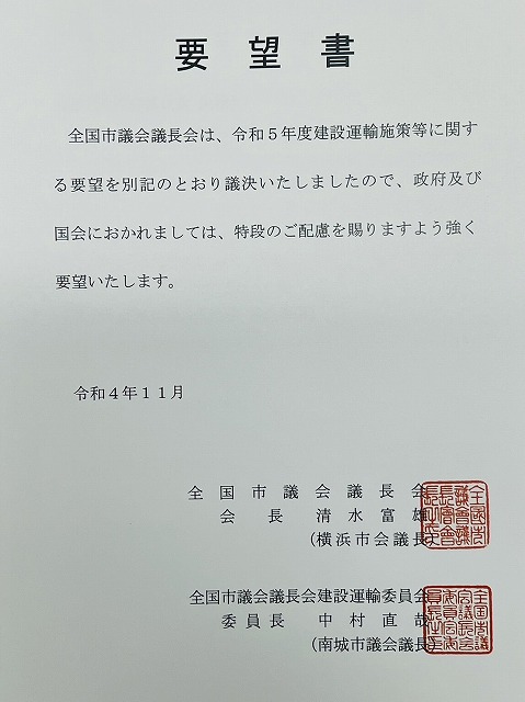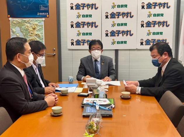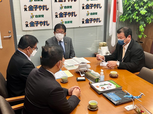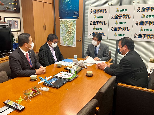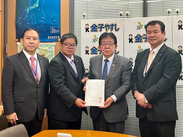 全国市議会議長会 建設運輸委員会・中村 委員長(沖縄県南城市議会議長)、石川 副委員長(福井県鯖江市議会議長)、小林 副委員長(大阪府池田市議会議長) 要望来室
