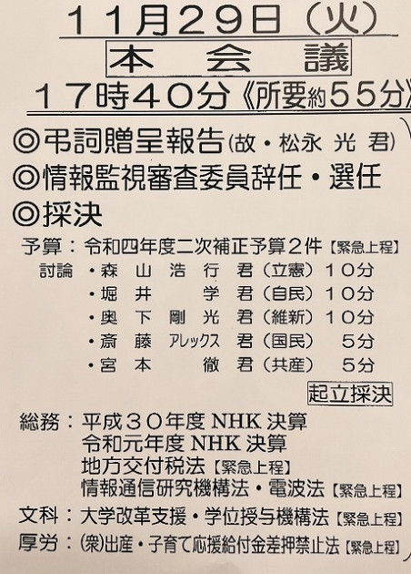 本会議「 令和4年度第2次補正予算案・関連法案など 採決・可決〔※衆議院通過→ 参議院へ送付 〕」※所要55分