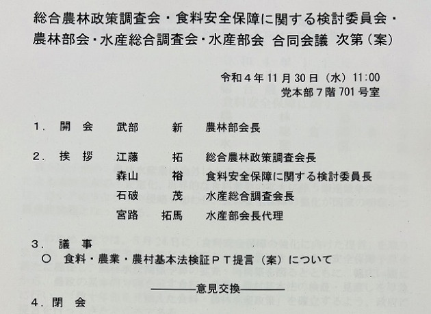 自民党 総合農林政策調査会・食料安全保障に関する検討委員会・農林部会・水産総合調査会・水産部会 合同会議