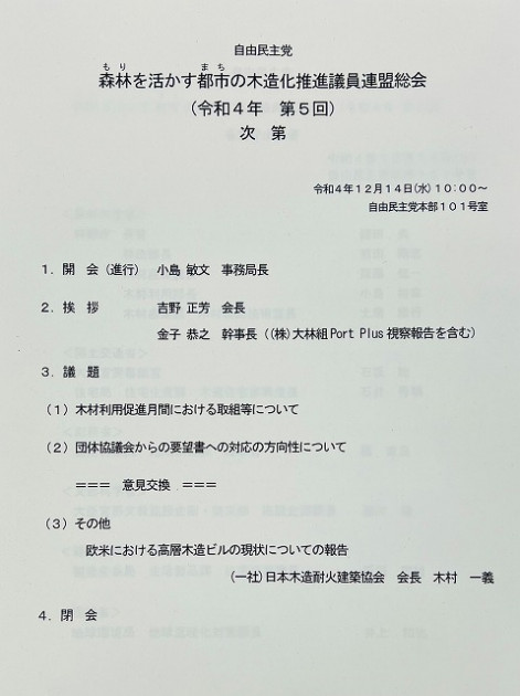 自民党 森林(もり)を活かす都市(まち)の木造化推進議員連盟「 総会 」 ※幹事長