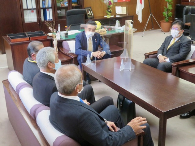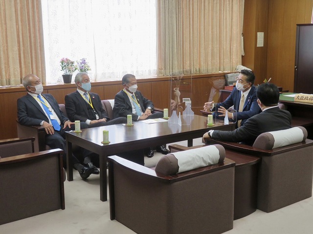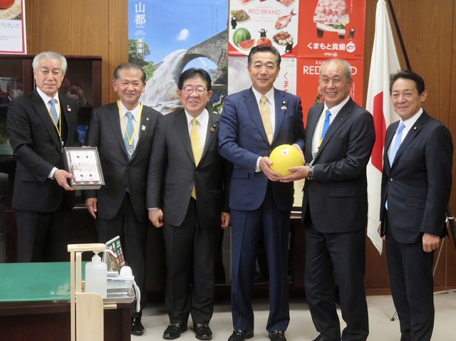 中村 八代市長、藤本 氷川町長、山住 JAやつしろ組合長「 藤木 農林水産大臣政務官へ 晩白柚 贈呈 」( 農林水産省・大臣政務官室 )※馬場 参議、松村 参議と共に同席