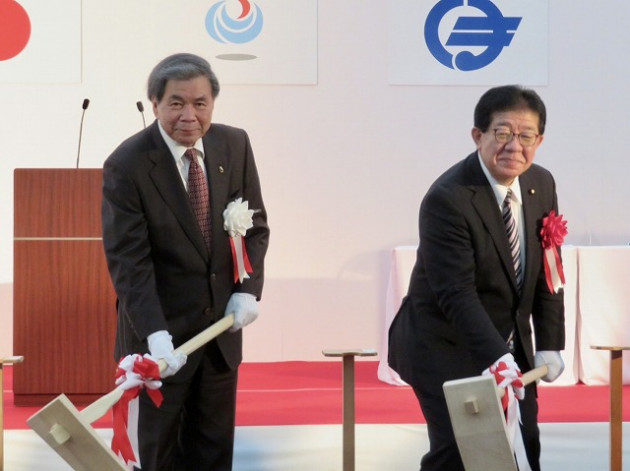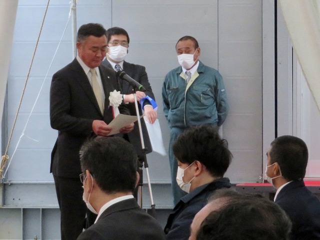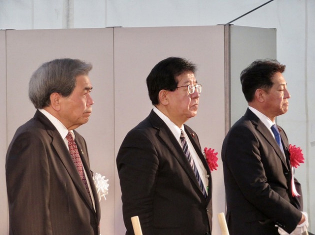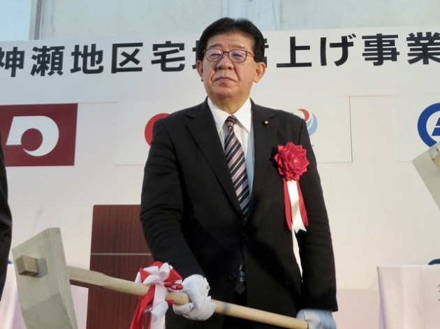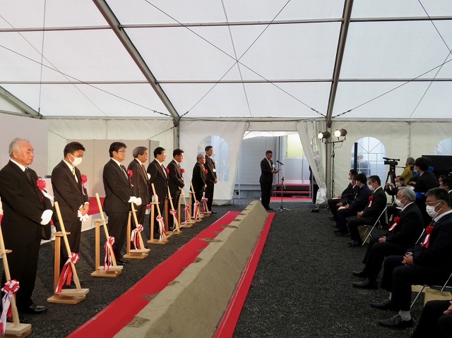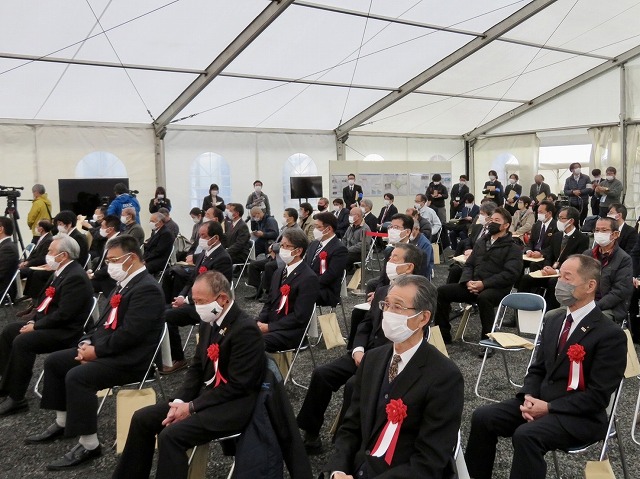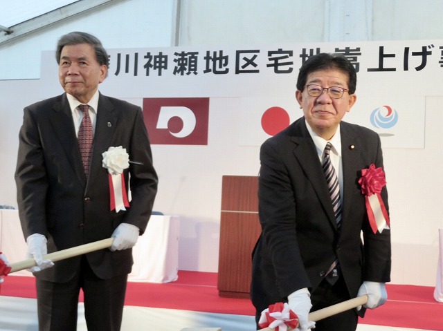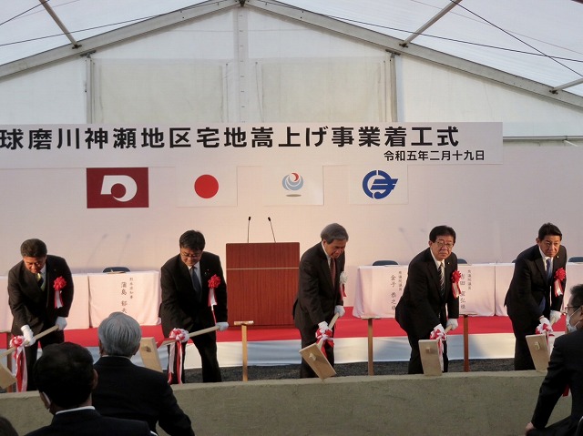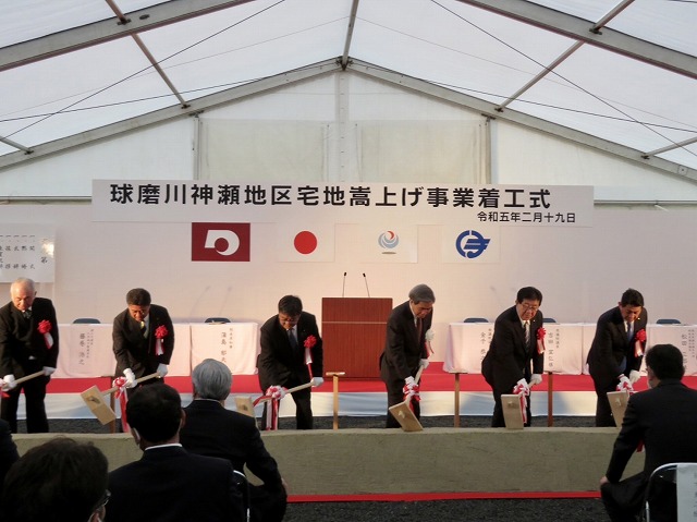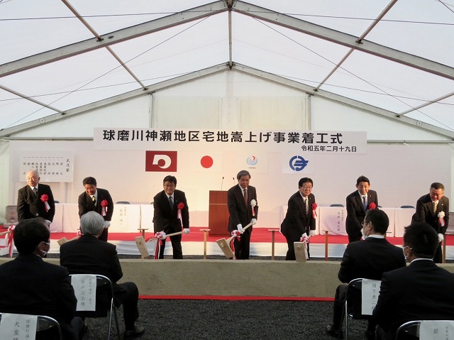「 球磨川神瀬地区宅地嵩上げ事業 」着工式( 球磨村 神瀬 川内川下流左岸 ) ※鍬入れ式