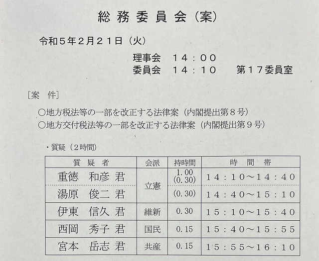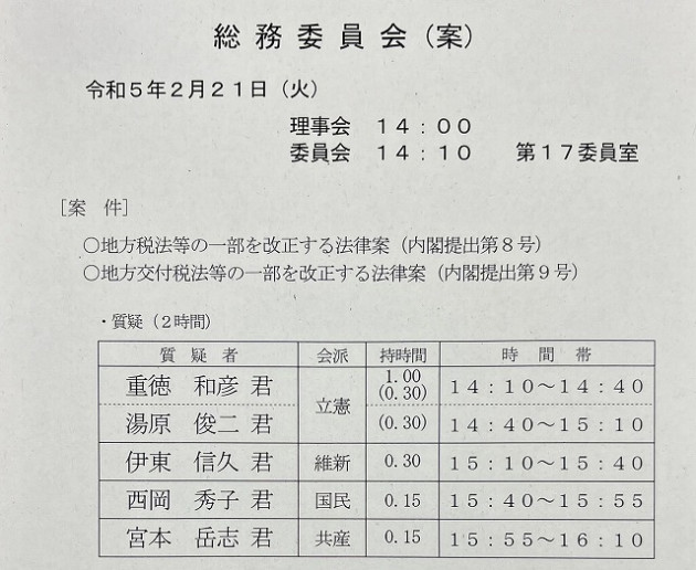 衆議院総務委員会「 地方税法・地方交付税法に関する質疑〔※所要 2時間 〕 」
