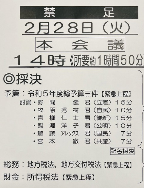 本会議「 令和5年度総予算三件 討論・採決、地方税法・地方交付税法 採決、所得税法 採決 」