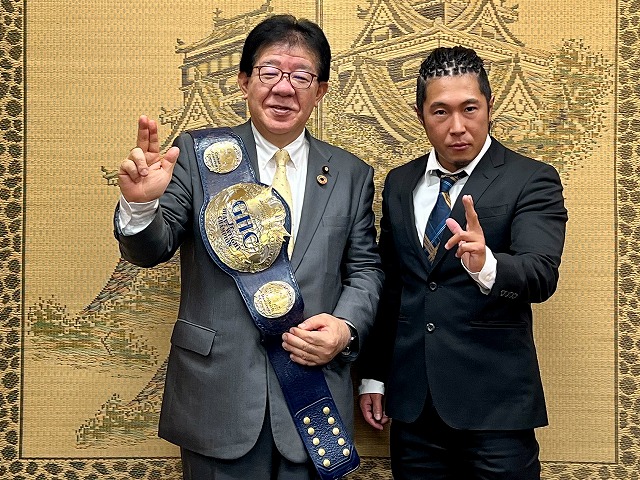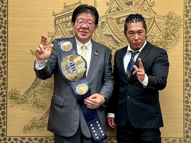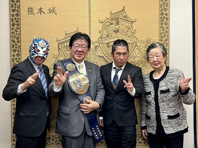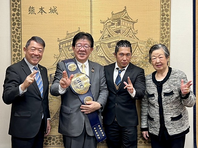 天草宝島観光協会・永田章一 前・会長〔※ストロング永田 〕、田中敬子 故・力道山 夫人、プロレス団体 ノア ジュニアヘビー級チャンピオン・AMAKUSA選手 来室