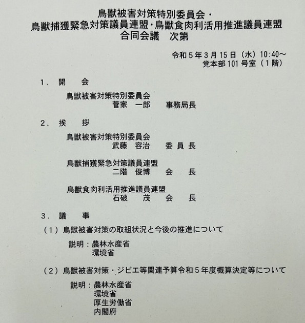 自民党 鳥獣被害対策特別委員会・鳥獣捕獲緊急対策議員連盟・鳥獣食肉利活用推進議員連盟 合同会議