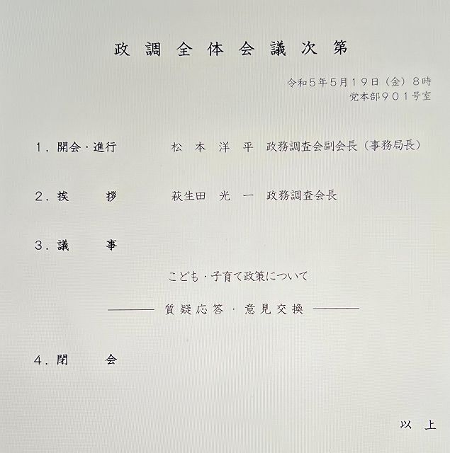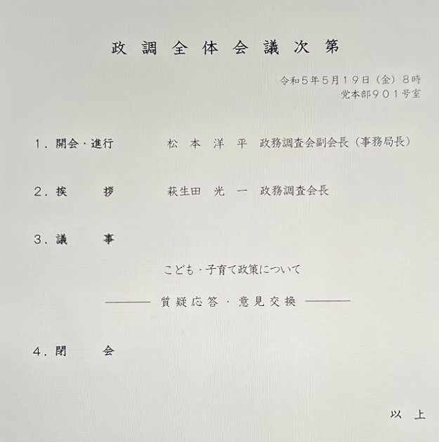 自民党 政調全体会議/こども・子育て政策について