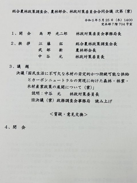 自民党 総合農林政策調査会・農林部会・林政対策委員会 合同会議 ※林政対策委員会 顧問