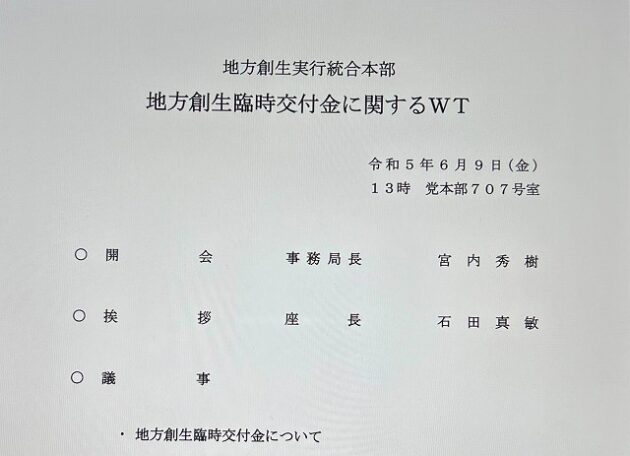 自民党 地方創生実行統合本部 地方創生臨時交付金に関するWT