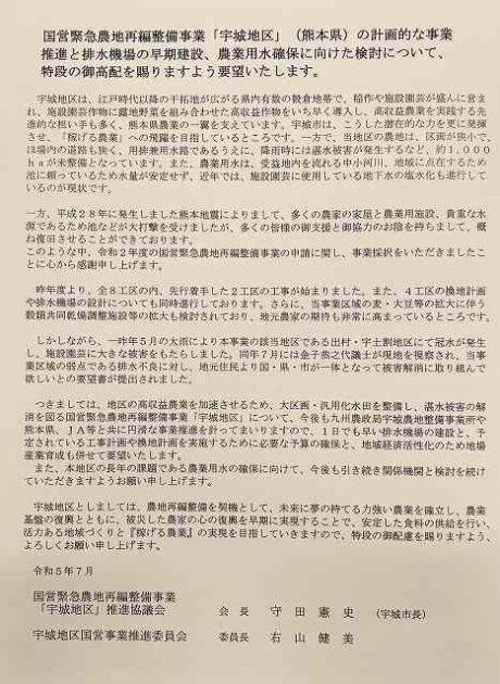 国営緊急農地再編整備事業「宇城地区」推進協議会・宇城地区国営事業推進委員会・宇城市『国営緊急農地再編整備事業宇城地区の事業促進と令和6年度予算の確保に向けて』要望来室