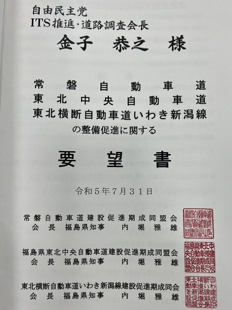 常磐自動車道建設促進期成同盟会・福島県東北中央自動車道建設促進期成同盟会・東北横断自動車道いわき新潟線建設促進期成同盟会 合同要望(自民党本部)※ITS推進・道路調査会長として対応