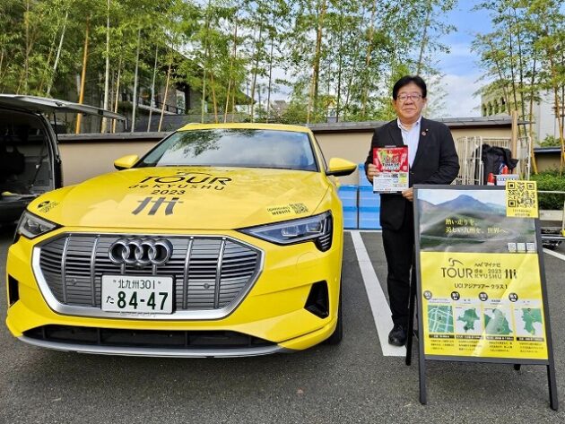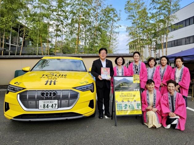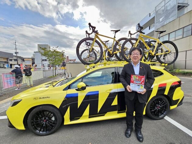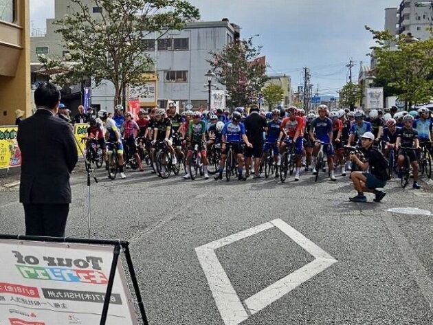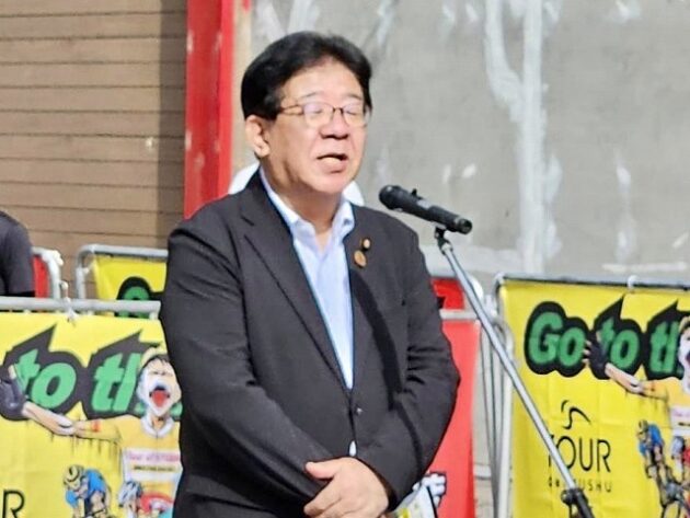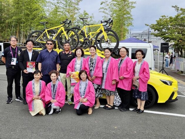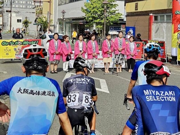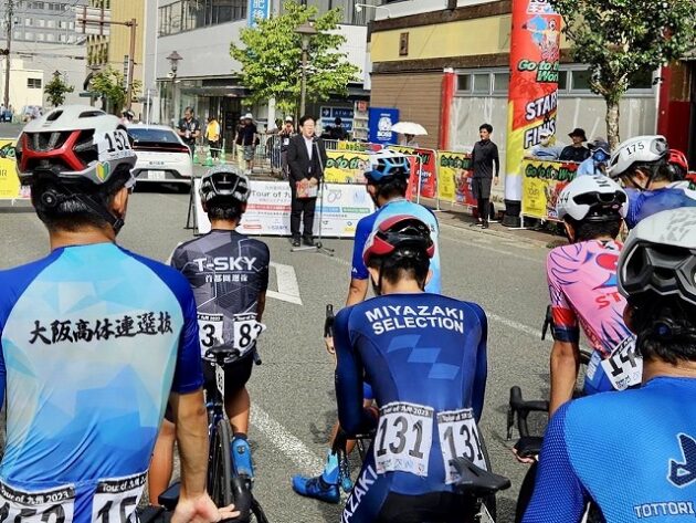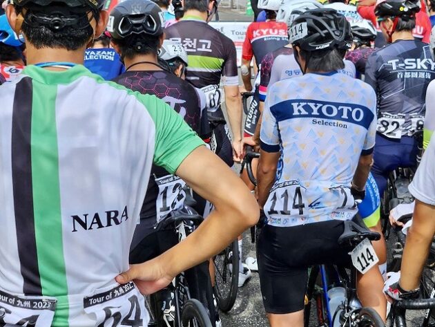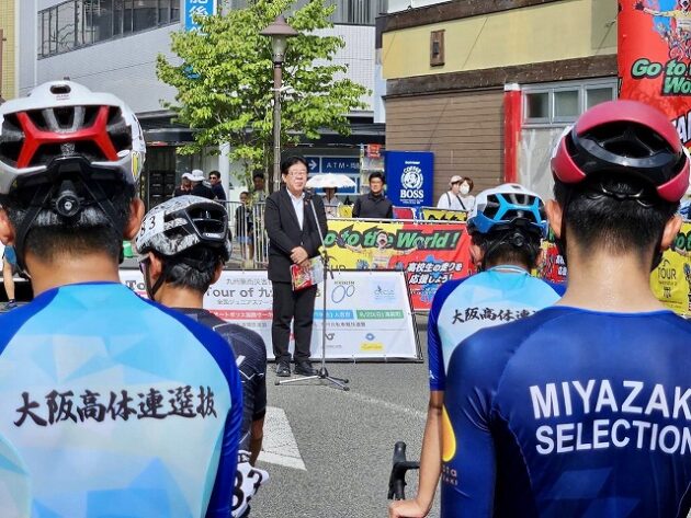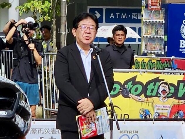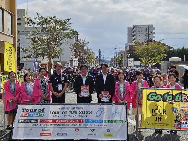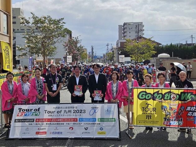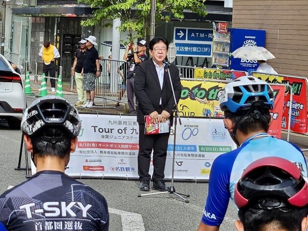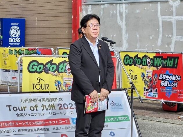 熊本県自転車競技連盟 主催『 全国ジュニアステージロードレース 九州豪雨災害復興祈念「 ツアー オブ 九州 2023 」人吉ステージ 』開会式(人吉市・あゆの里 前 )※超党派 自転車活用推進議員連盟 幹事長として挨拶