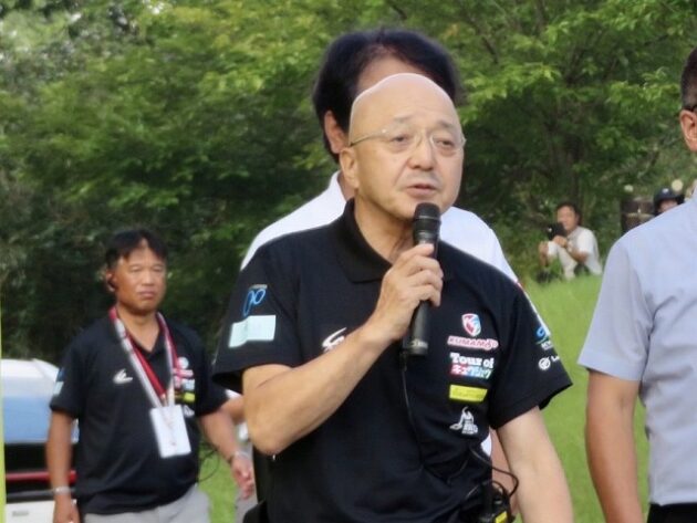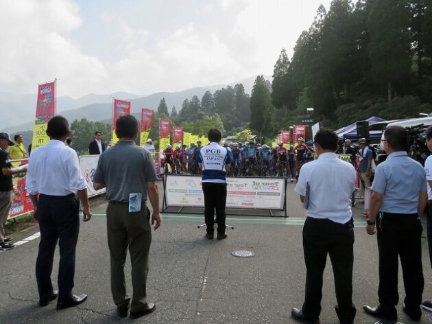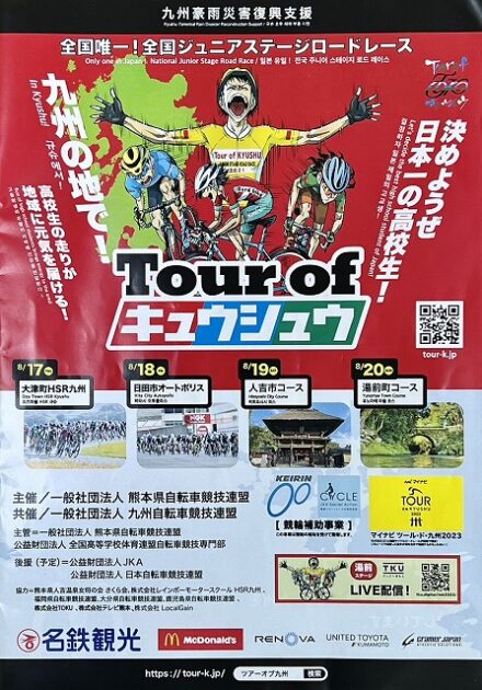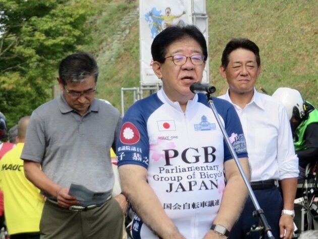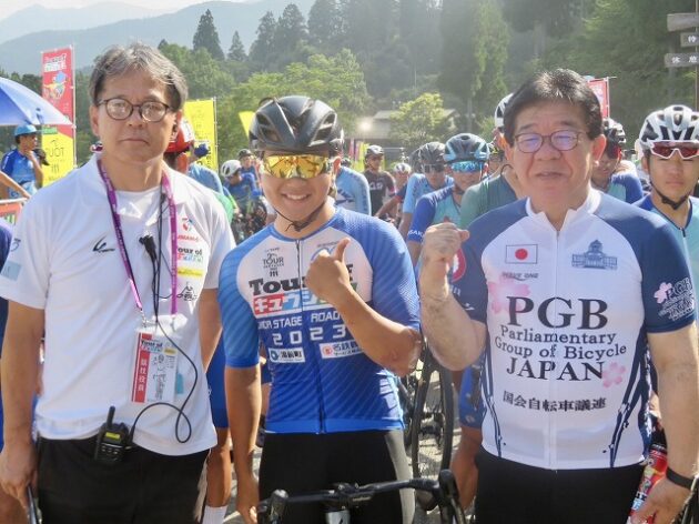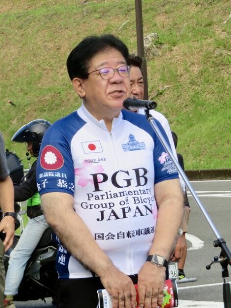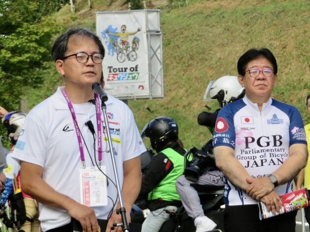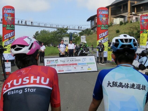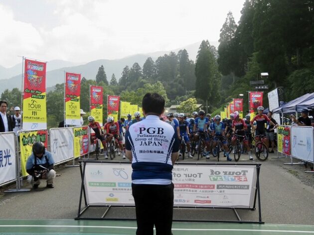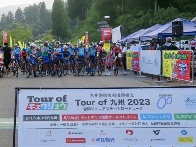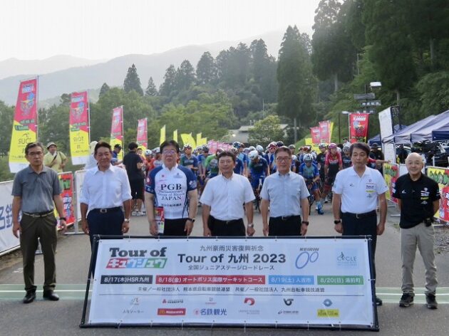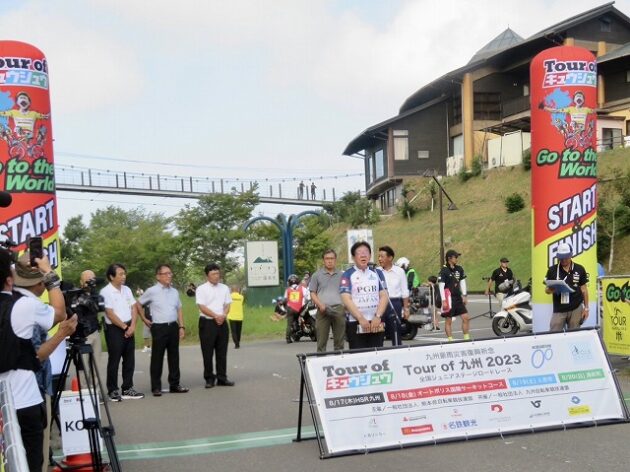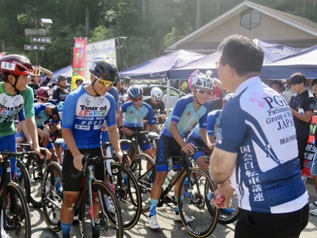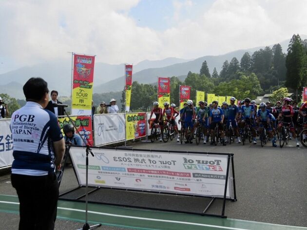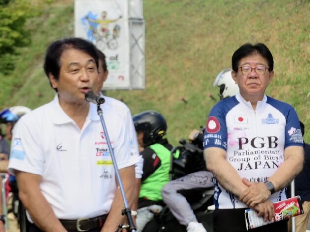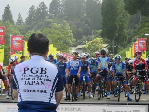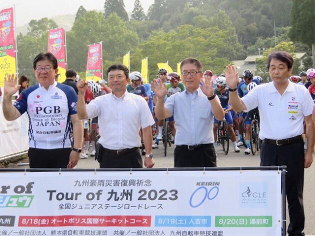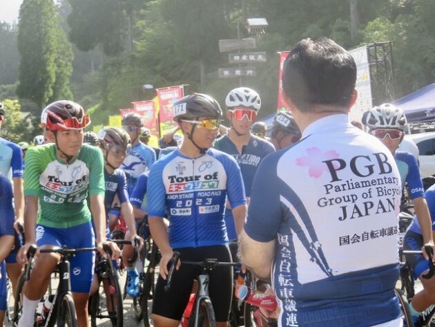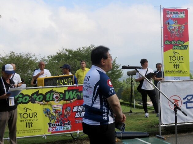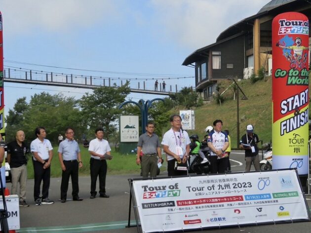 熊本県自転車競技連盟 主催『 全国ジュニアステージロードレース 九州豪雨災害復興祈念「 ツアー オブ 九州 2023 」湯前ステージ 』開会式(湯前町・グリーンパレス芝生広場 駐車場前 )※超党派 自転車活用推進議員連盟 幹事長として挨拶