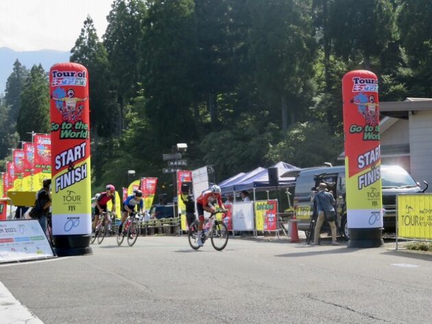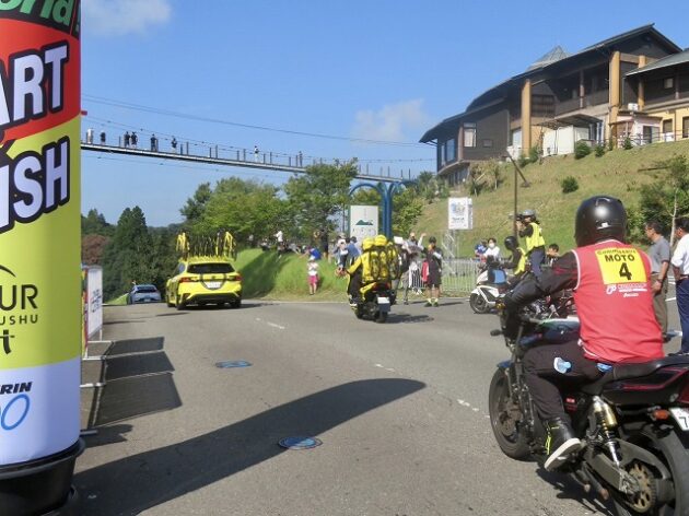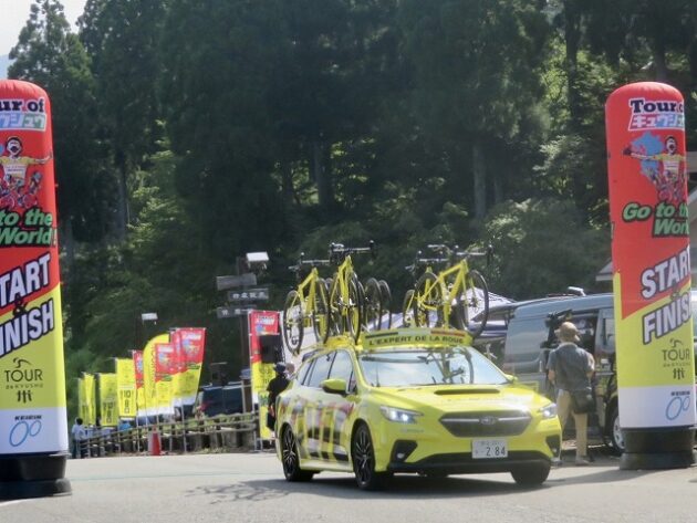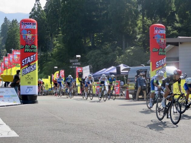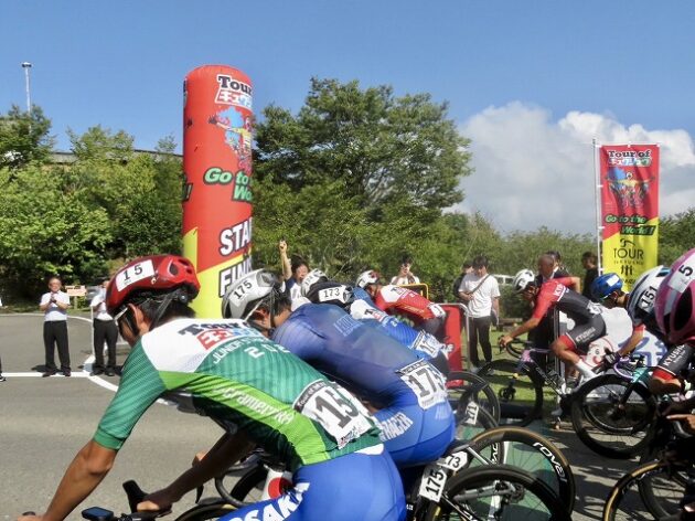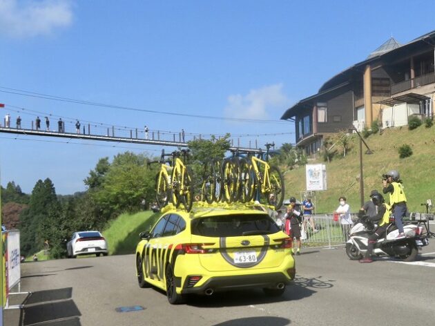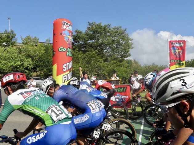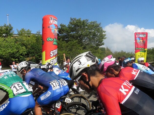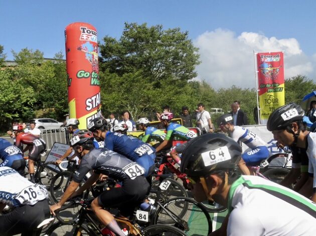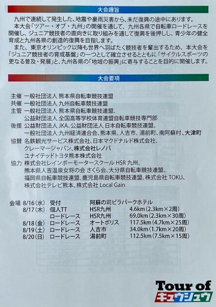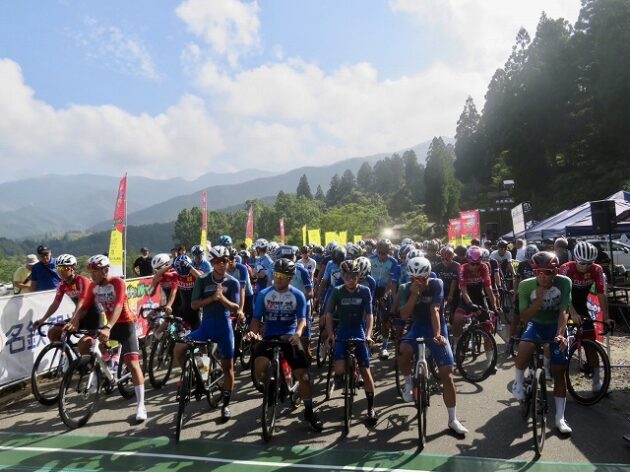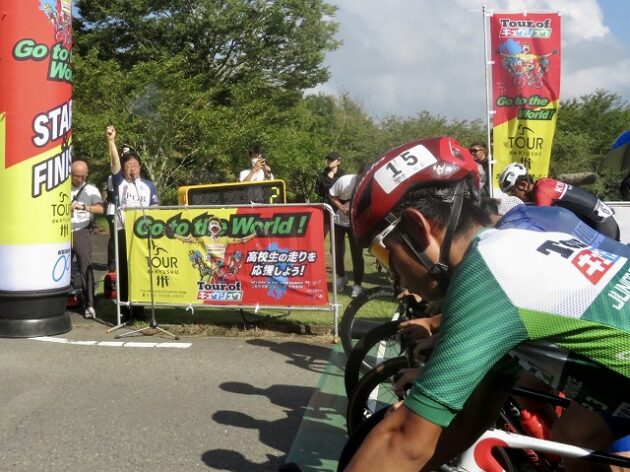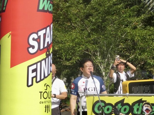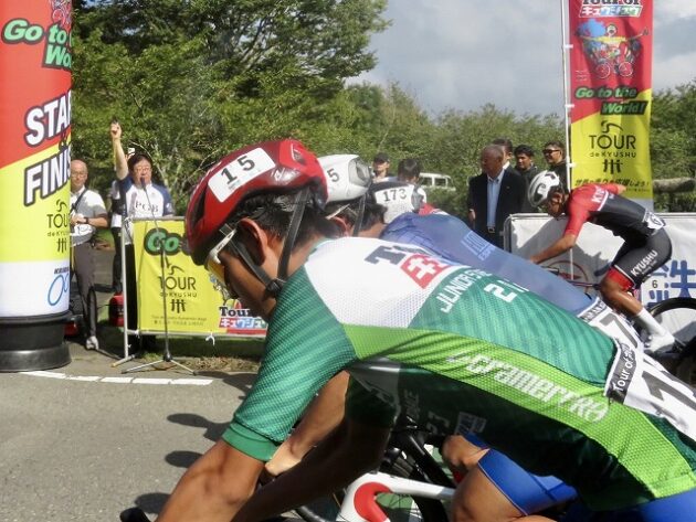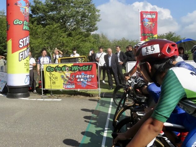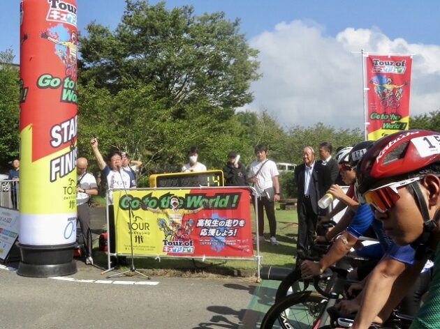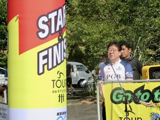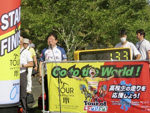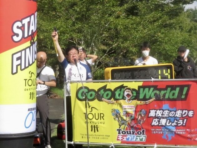 熊本県自転車競技連盟 主催『 全国ジュニアステージロードレース 九州豪雨災害復興祈念「 ツアー オブ 九州 2023 」湯前ステージ 』レース(湯前町・グリーンパレス芝生広場 駐車場前 スタート・ゴール )※超党派 自転車活用推進議員連盟 幹事長として、スターター・観戦