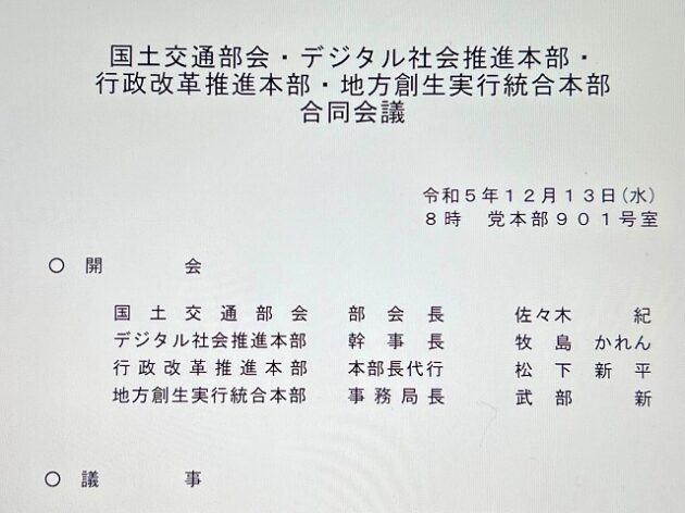 自民党 国土交通部会・デジタル社会推進本部・行政改革推進本部・地方創生実行統合本部 合同会議 ※地方創生実行統合本部 本部長代理
