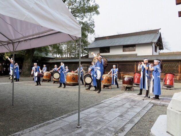 八代建国記念日奉祝会「 建国記念の日 奉祝式典 」 開会前の秀岳館高校・雅太鼓( 八代市・八代宮 拝殿前 )