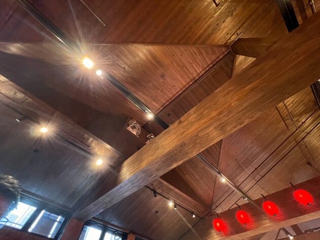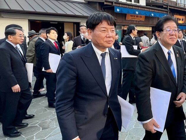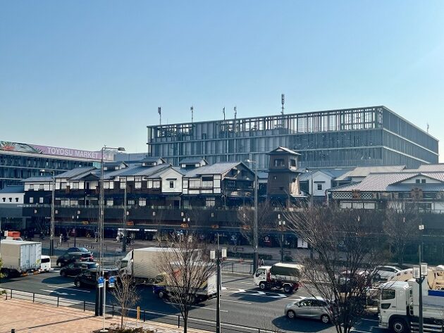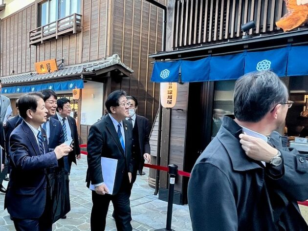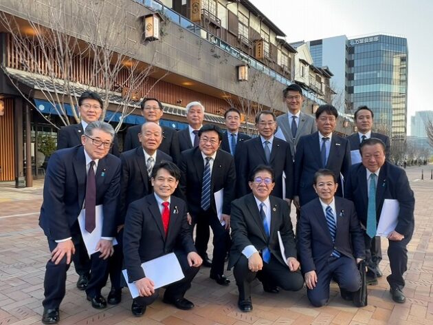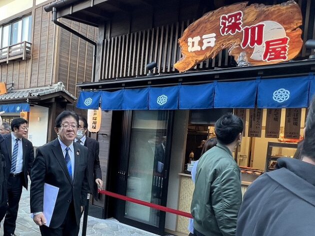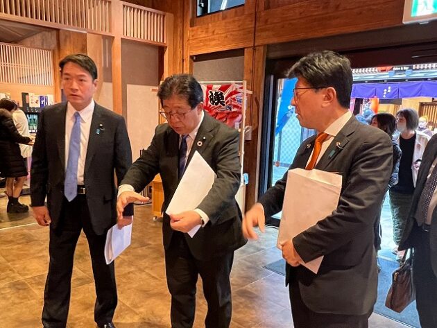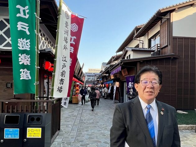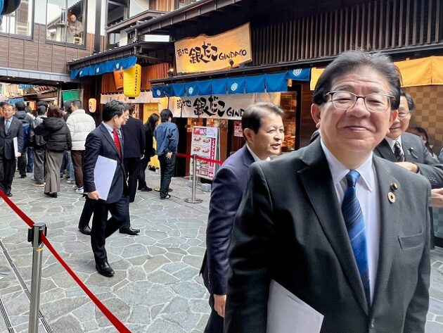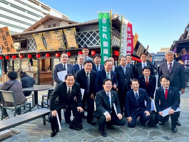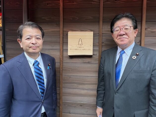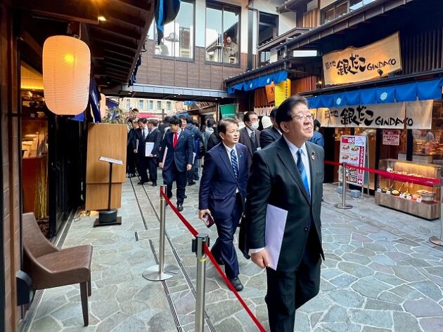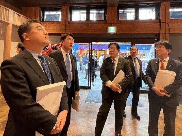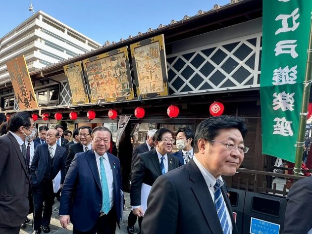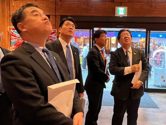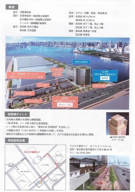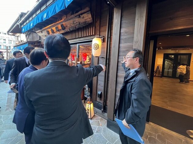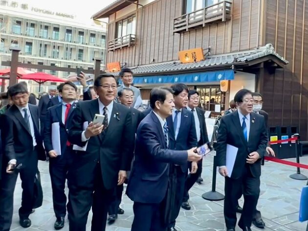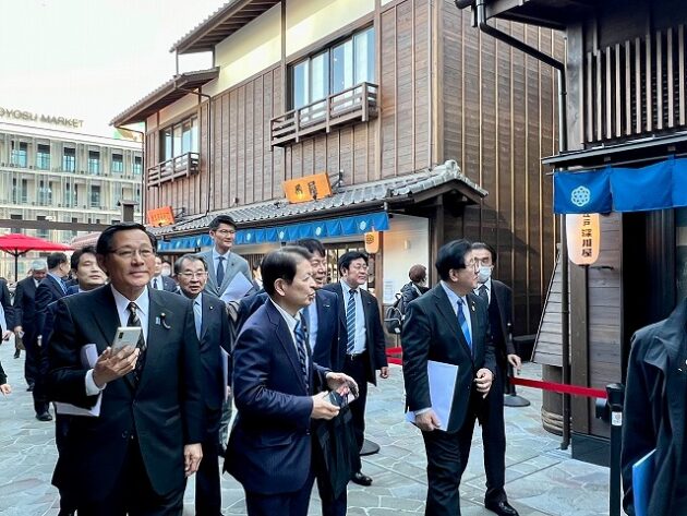 自民党 森林を活かす都市の木造化推進議員連盟「 豊洲 千客万来 」 視察 ②木造エリア〔 食楽棟 〕 視察( 江東区豊洲・豊洲 千客万来 食楽棟 ) ※視察団 団長〔 議員連盟 会長代行 兼 幹事長 〕