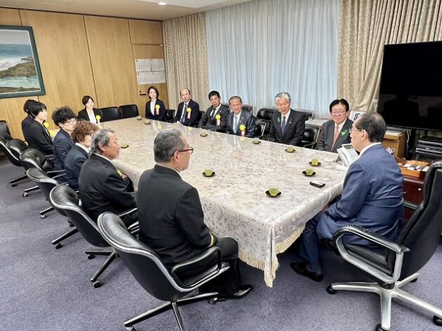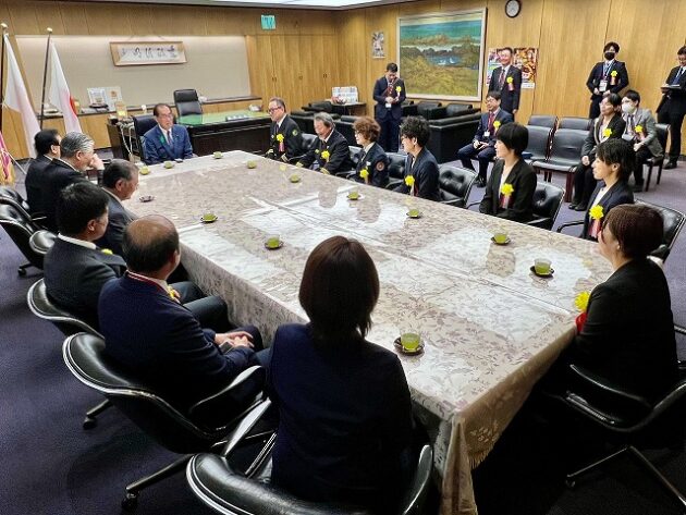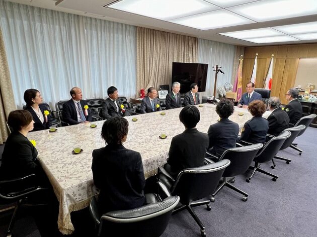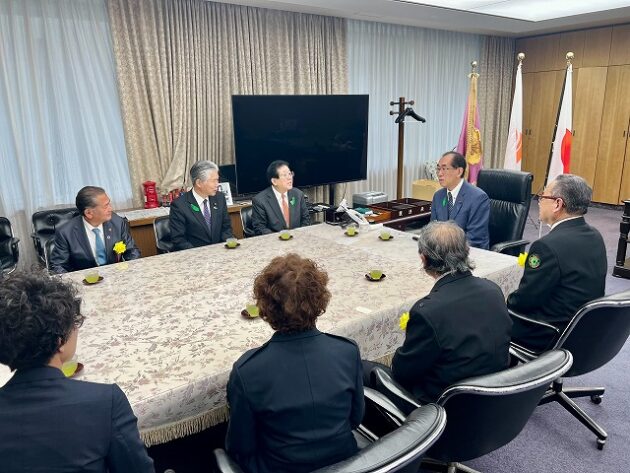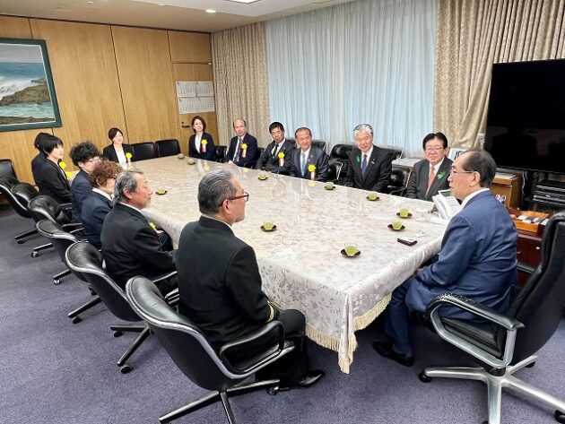 中村 八代市長、山本 八代市消防団長、上野 八代広域消防本部消防長、八代市本部女性消防隊、中口 熊本市消防団長、山口 熊本県消防協会長ほか「 総務大臣表彰 受賞 松本総務大臣を表敬訪問 」( 総務大臣室 )※馬場総務副大臣と共に陪席