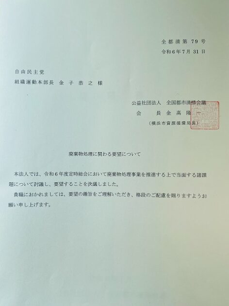 全国都市清掃会議「 廃棄物行政に対する財政措置の強化拡充等に関する要望 」申し入れ( 自民党本部・会議室 )※自民党組織運動本部長として対応