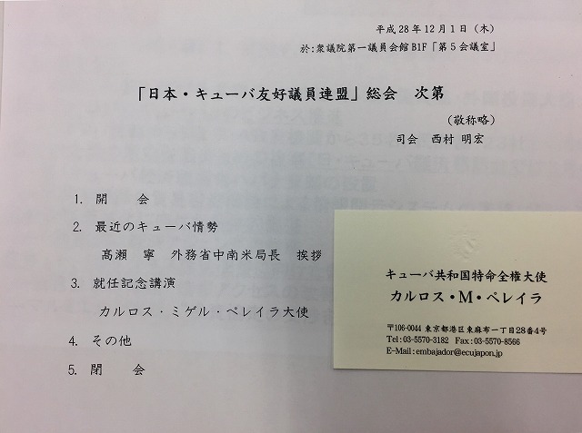 超党派「 日本・キューバ友好議員連盟 」総会 カルロス ミゲル ペレイラ駐日キューバ共和国特命全権大使 就任記念講演 ※幹事長代理