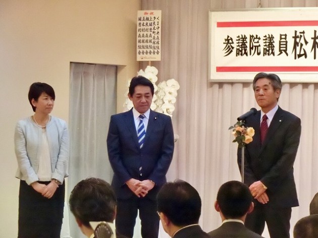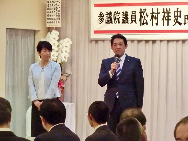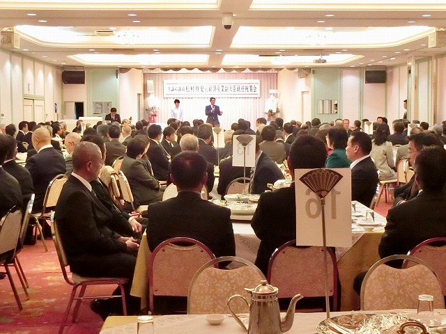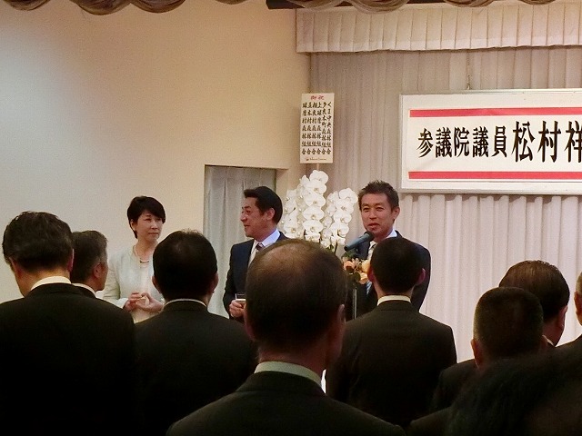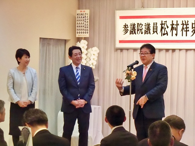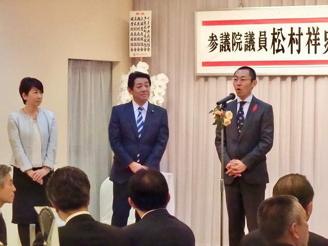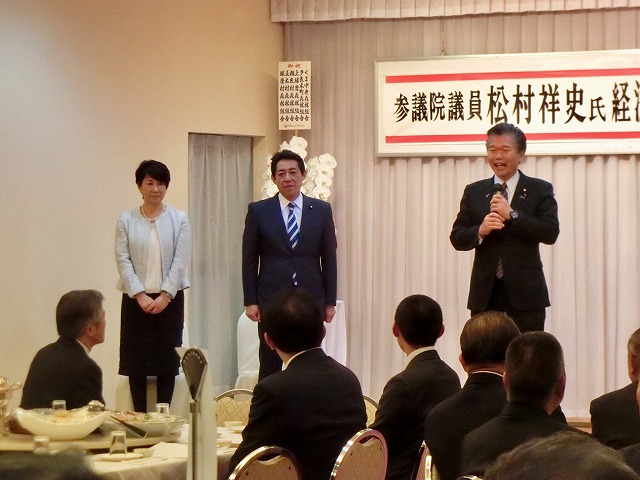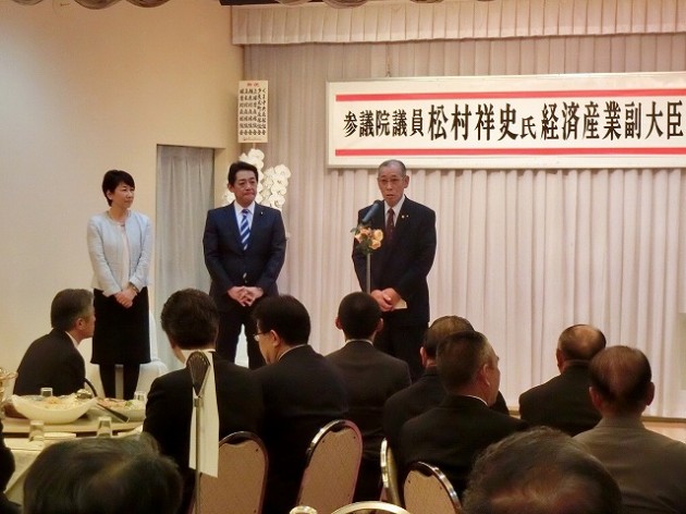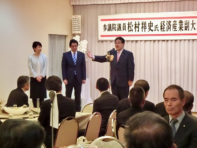 球磨郡町村会・議長会、人吉市長・議長、国会議員〔金子恭之〕、県議会議員〔松田三郎・溝口幸治・緒方勇ニ〕 主催「 松村祥史経済産業副大臣就任を祝う会」( 錦町内 )