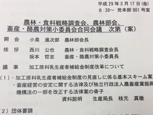 自民党 農林・食料戦略調査会、農林部会、畜産・酪農対策小委員会 合同会議