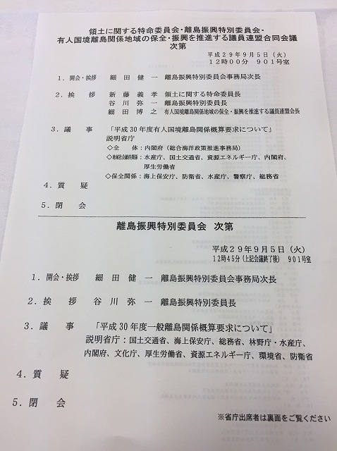 自民党 領土に関する特命委員会、離島振興特別委員会、有人国境離島関係地域の保全・振興を推進する議員連盟 合同会議