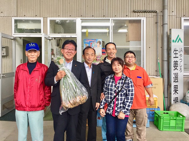 熊本地震復興祈願「第43回 東陽しょうが祭(八代市東陽町)」が、台風による悪天候のため 中止になり、JAやつしろ生姜選果場で行なわれている生姜部会の直売会を激励