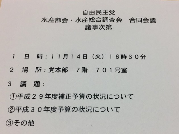 自民党 水産部会・水産総合調査会 合同会議 ※水産総合調査会 副会長