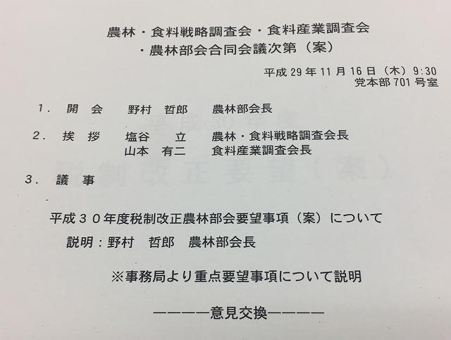 自民党 農林・食料戦略調査会、食料産業調査会、農林部会 合同会議