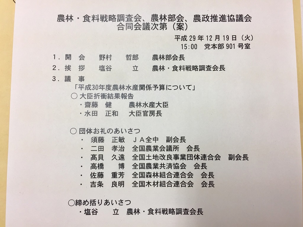 自民党 農林・食料戦略調査会、農林部会、農政推進協議会 合同会議
