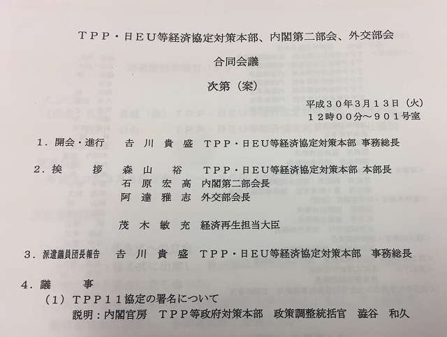 自民党 TPP・日EU等経済協定対策本部、内閣第二部会、外交部会 合同会議