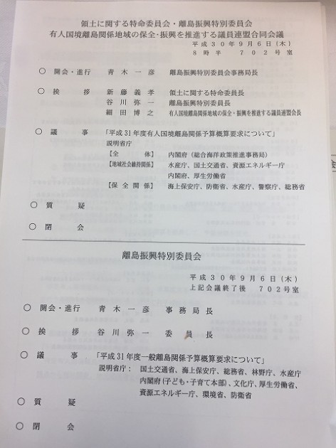 自民党 領土に関する特命委員会、離島振興特別委員会、有人国境離島関係地域の保全・振興を推進する議員連盟 合同会議