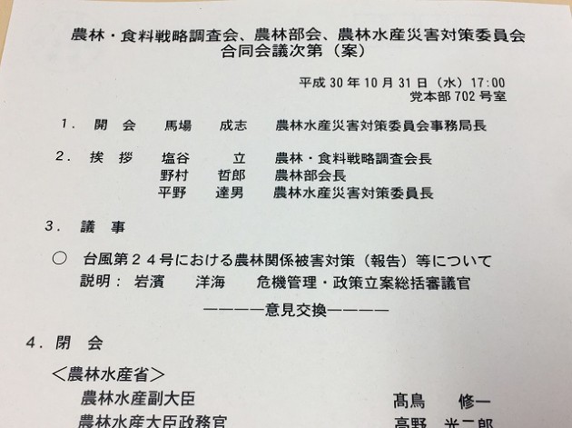 自民党 農林・食料戦略調査会、農林部会、農林水産災害対策委員会 合同会議