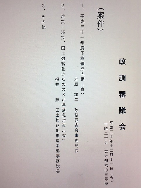 自民党 政調審議会「平成31年度予算編成大綱(案)、防災・減災、国土強靭化のための3か年緊急対策(案)について」 ※政調会長代理