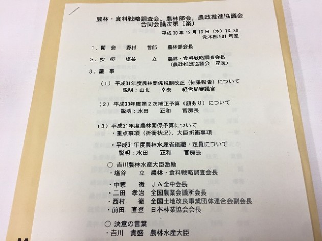 自民党 農林・食料戦略調査会、農林部会、農政推進協議会 合同会議