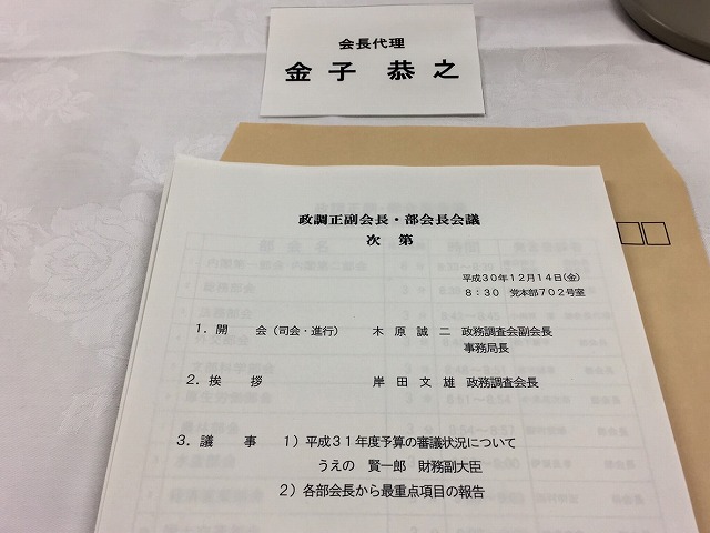 自民党 政調 正副会長・部会長会議「政府から平成31年度予算の審議状況について聴取、各部会長から最重点項目の報告」 ※政調会長代理