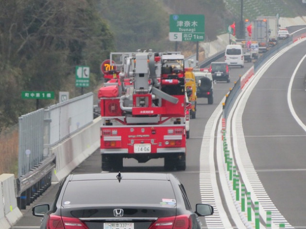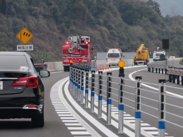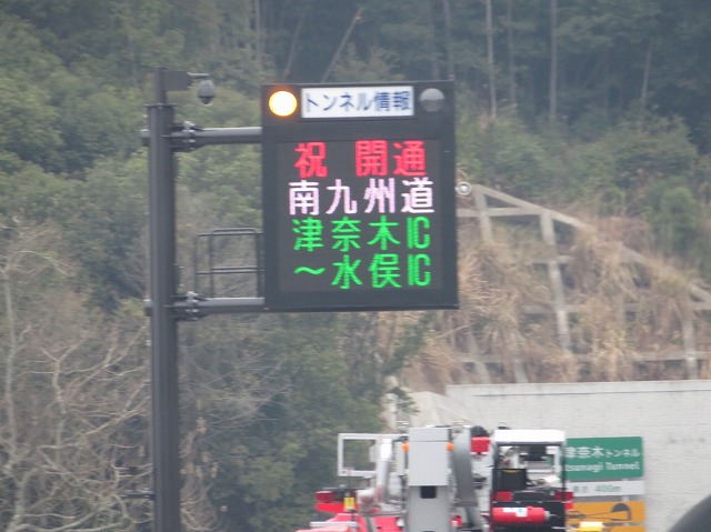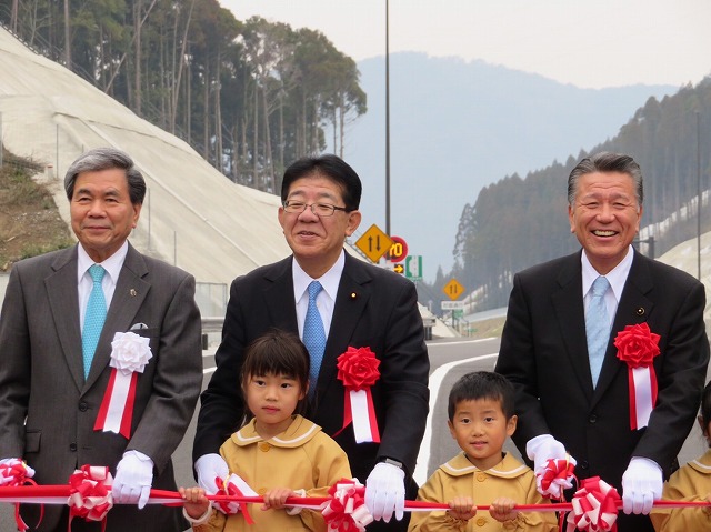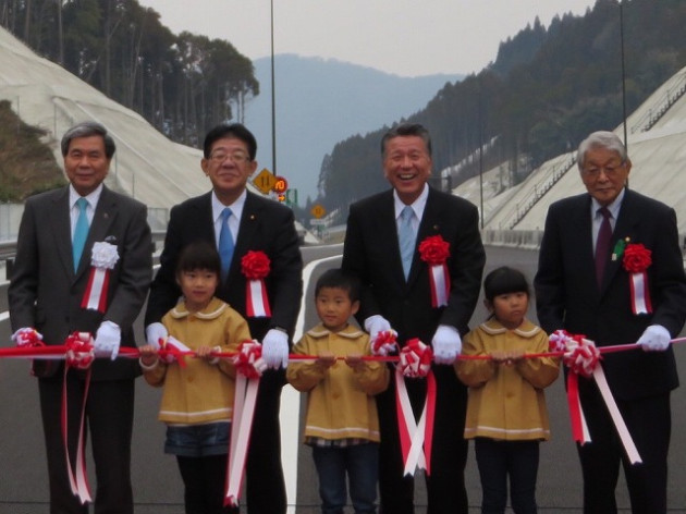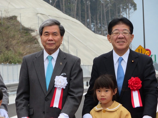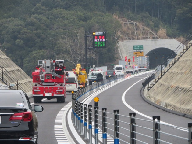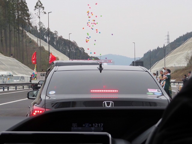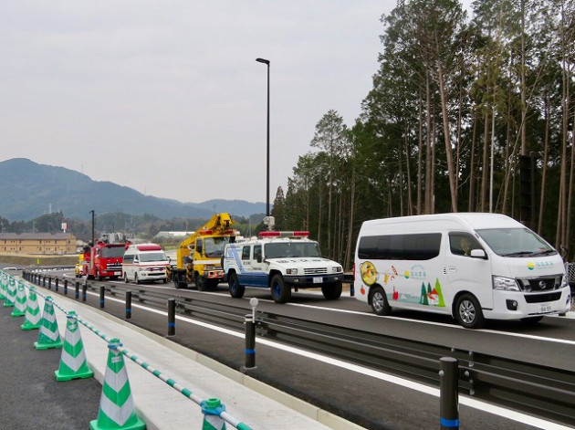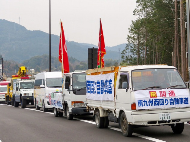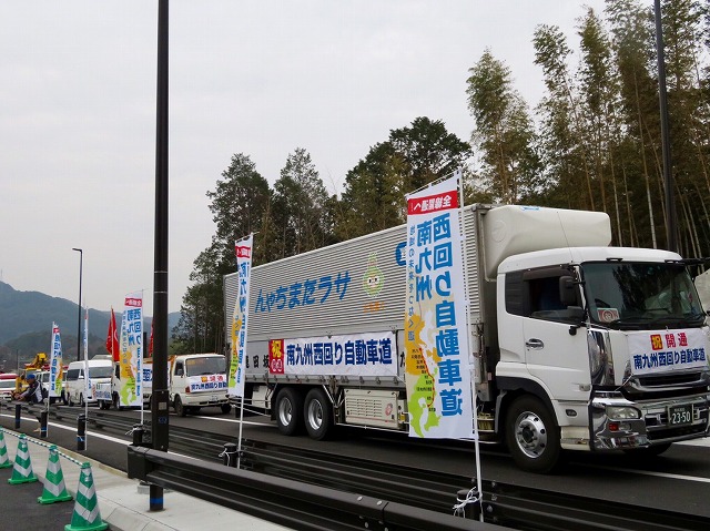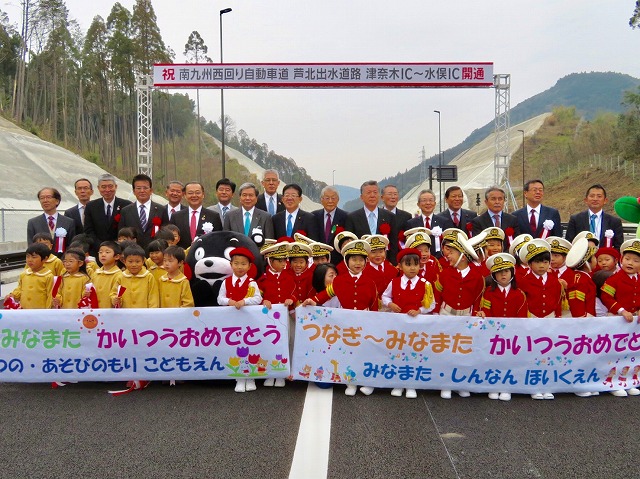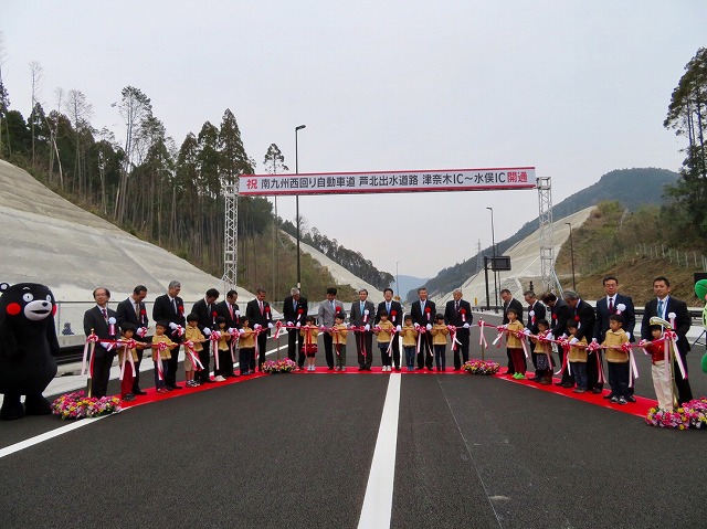 南九州西回り自動車道 芦北出水道路〔津奈木IC〜水俣IC〕開通式典「 ※テープカット → パレード 」(水俣IC) ※南九州西回り自動車道建設促進議員連盟・会長