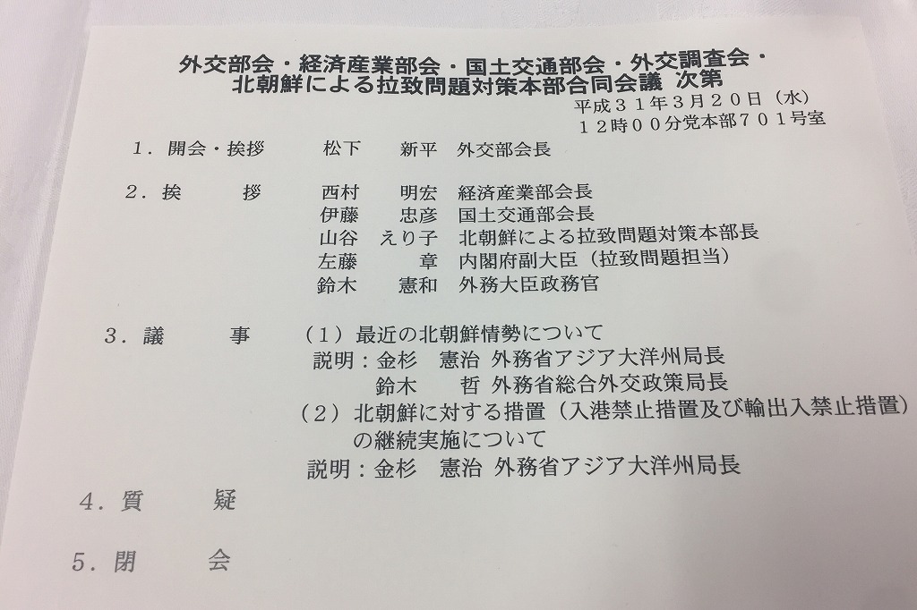 自民党 外交部会・経済産業部会・国土交通部会・外交調査会・北朝鮮による拉致問題対策本部 合同会議 ※担当 政調会長代理