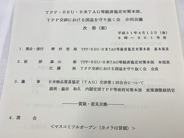 自民党TPP・日EU・日米TAG等経済協定対策本部、TPP交渉における国益を守り抜く会 合同会議