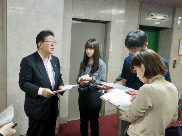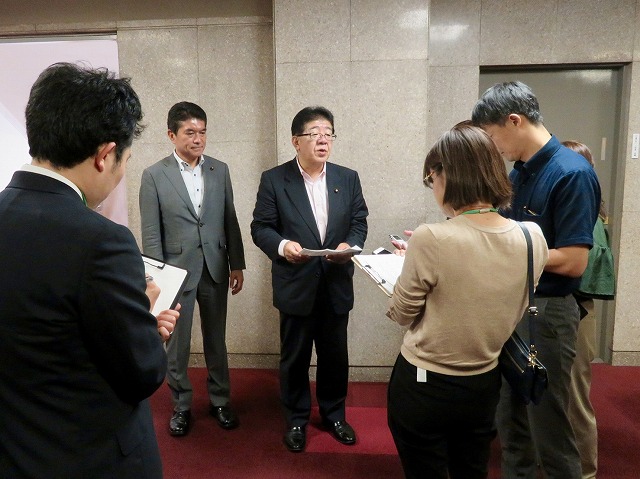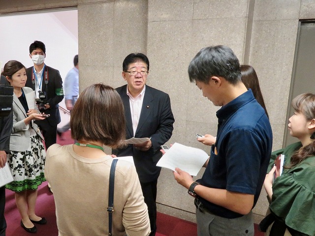 自民党 農林・食料戦略調査会、農林部会、林政対策委員会「森林・林業・木材産業政策の更なる推進について 決議」吉川農林水産大臣へ申し入れ(農林水産省・大臣室)後のマスコミぶら下がり取材へ林政対策委員長として対応