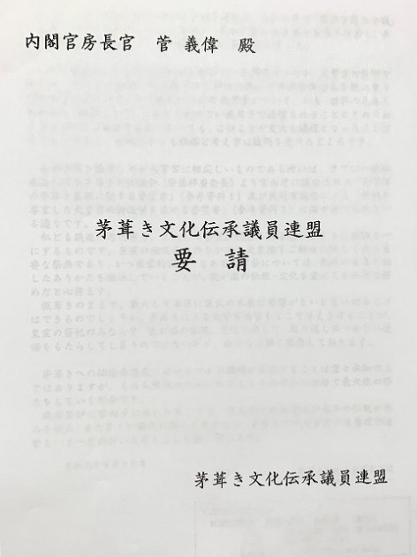 自民党 茅葺き文化伝承議員連盟「大嘗宮を茅葺きに」菅義偉 内閣官房長官へ要請(総理官邸)