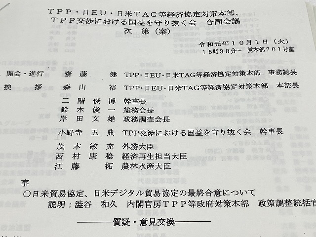 自民党 TPP・日EU・日米TAG等経済協定対策本部、TPP交渉における国益を守り抜く会 合同会議