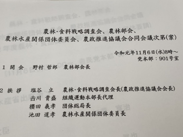 自民党 農林・食料戦略調査会、農林部会、農林水産関係団体委員会、農政推進協議会 合同会議