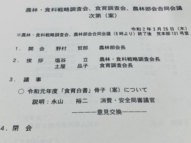 自民党 農林・食料戦略調査会、食育調査会、農林部会 合同会議