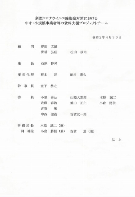 自民党 新型コロナウイルス感染症対策における中小・小規模事業者等の賃料支援プロジェクトチーム ※幹事長